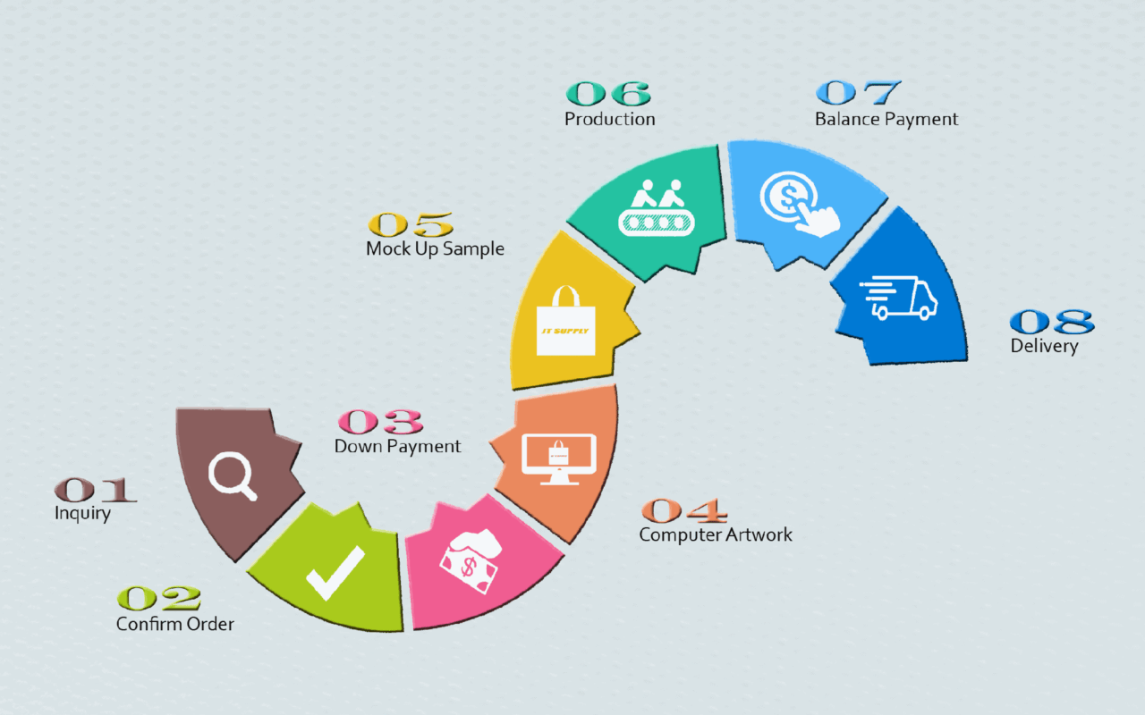 - Step 1 — Inquiries: Check out our product list to see our range of reusable bags, their specifications, and minimum order quantity.